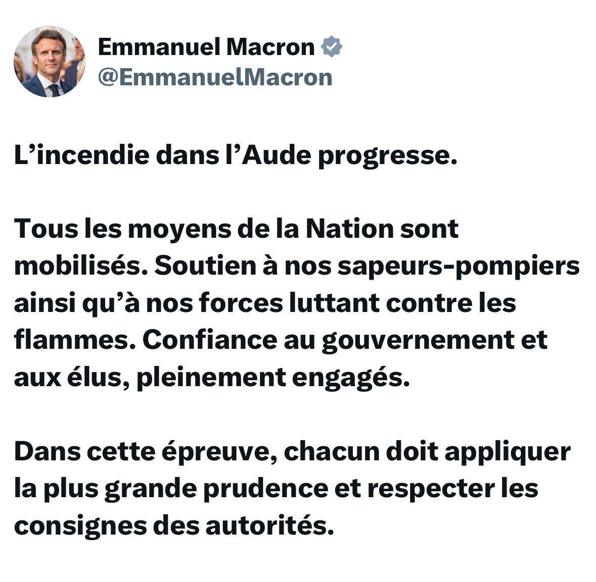 وغرد الرئيس الفرنسي ايمانويل ماكرون علي صفحته بمنصة إكس: "ينتشر الحريق في مقاطعة ل أود. جميع الهواتف المحمولة في البلاد معطلة. نعلم أيضًا أن رجال الإطفاء لدينا يُكافحون النيران. لدينا ثقة في خطط الحكومة والجهات المختصة. هذه المرة، قد نحتاج إلى توخي أقصى درجات الحذر والالتزام بتعليمات (الطرق) المرور الفرنسي".