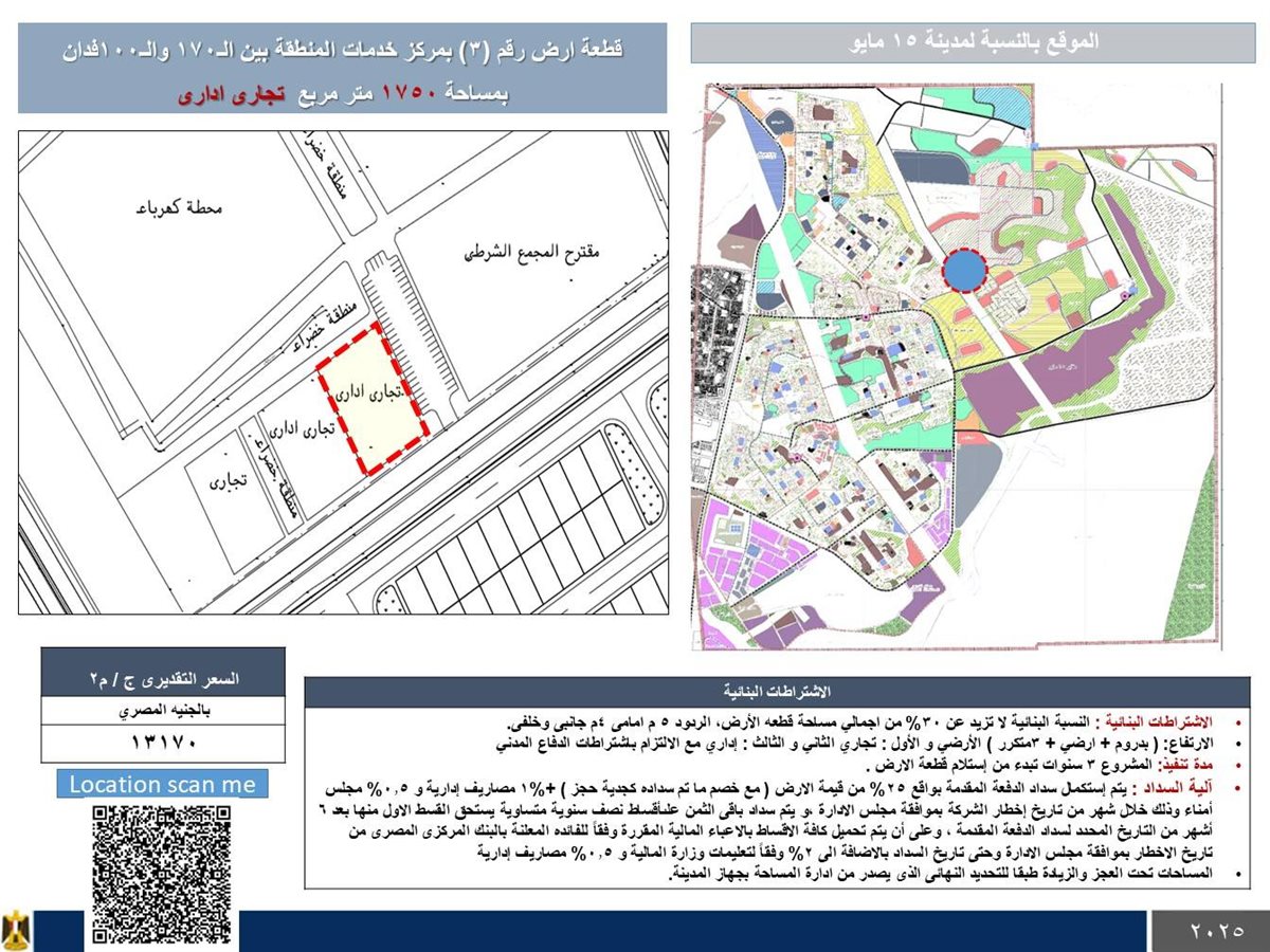 - قطعة أرض رقم (3) بمركز خدمات المنطقة بين الـ170 والـ100 فدان بنشاط تجاري إداري على مساحة 1750 م².