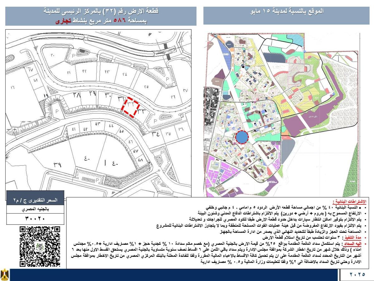 - قطعة أرض رقم (32) بالمركز الرئيس بنشاط تجاري على مساحة 586 م².