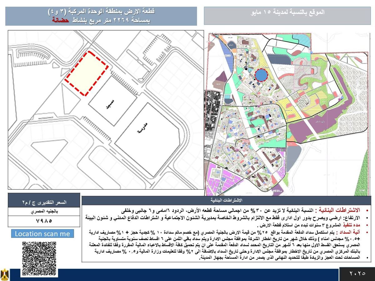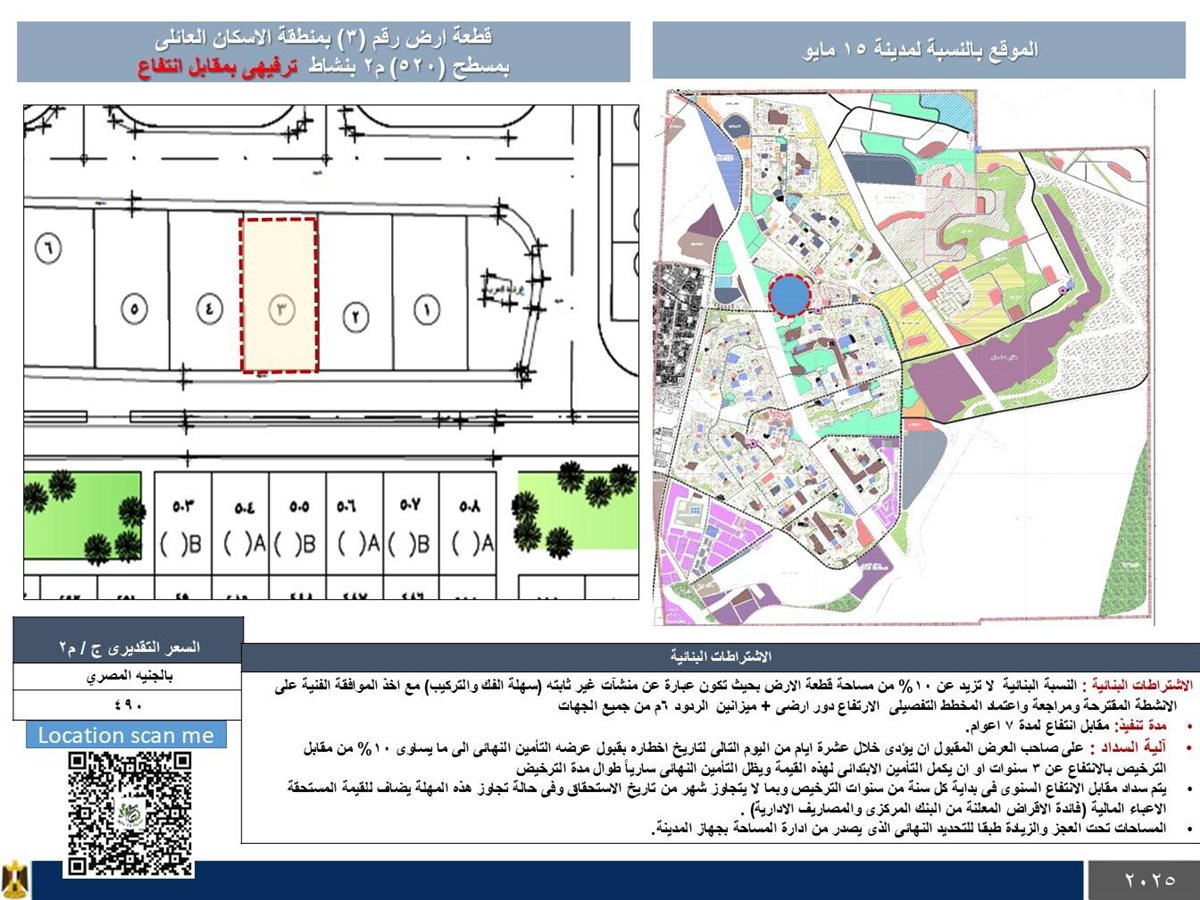 فرصة استثمارية.. طرح 6 قطع أراضٍ للبيع بمدينة 15 مايو بأنشطة متنوعة