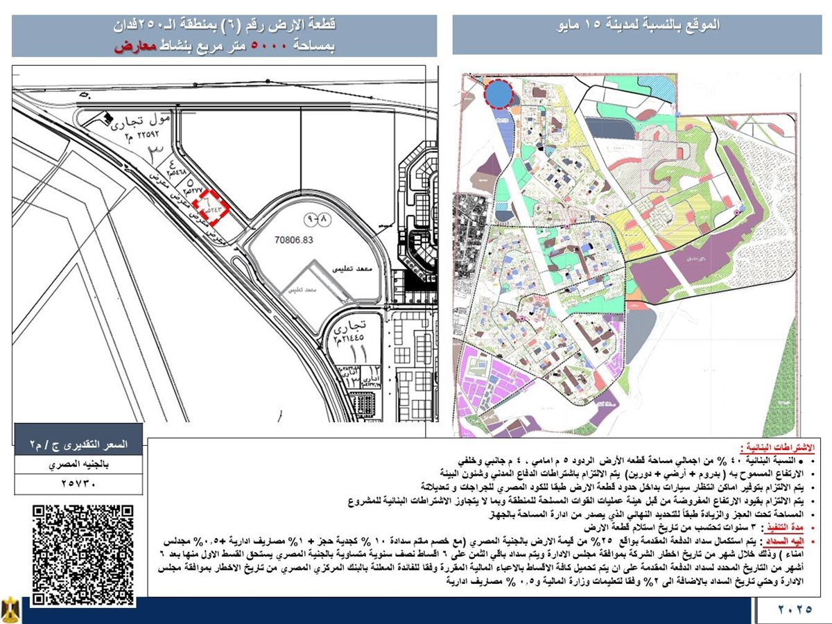 - قطعة أرض رقم (6) بمنطقة الـ 250 فدان الاستثمارية بنشاط معارض على مساحة 5000 م².