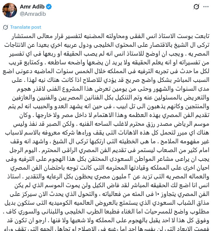 وكتب عمرو أديب خلال تعليقه على تغريدة أنس الفقي عبر منصة “إكس”: “تابعت بوست الأستاذ أنس الفقى ومحاولته المضنيه لتفسير قرار معالى المستشار تركى ال الشيخ بالإقتصار على المحتوى الخليجى ودول عربيه اخري بعيدا عن الانتاجات المصريه”.