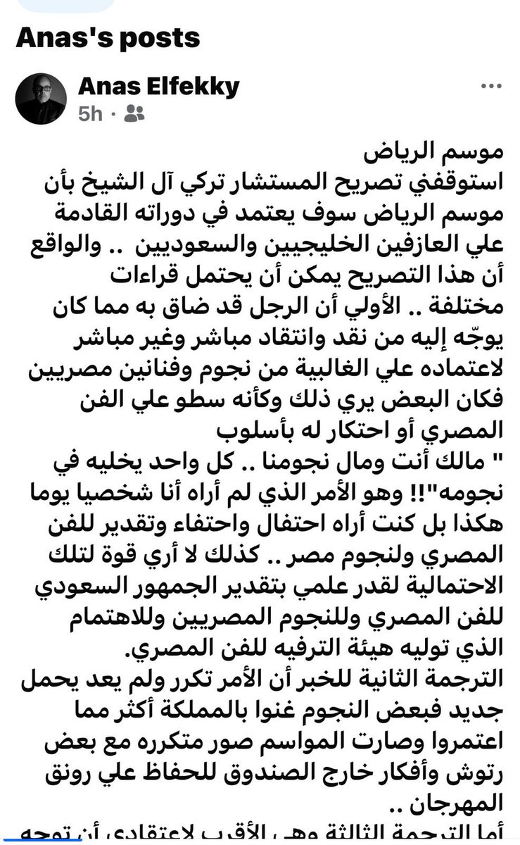 وتابع أديب موجهًا رسالته للفقي: “أستاذ أنس أنا أضع لك الحقيقه المباشرة لقد فاض الكيل ولن يموت الموسم الذي لم يكن الفن المصري يتجاوز ١٠ فى المئه من فعالياته ، والتحول الذي يحدث الآن سيركز على مذاق الشباب السعودي الذي يستمتع بالعروض العالميه الكوميديه التى ستكون بديلًا مطلوبًا واضحًا للمسرحيات، أما الغناء فطبعًا الطرب الخليجى واللبنانى والسوري كاف”.