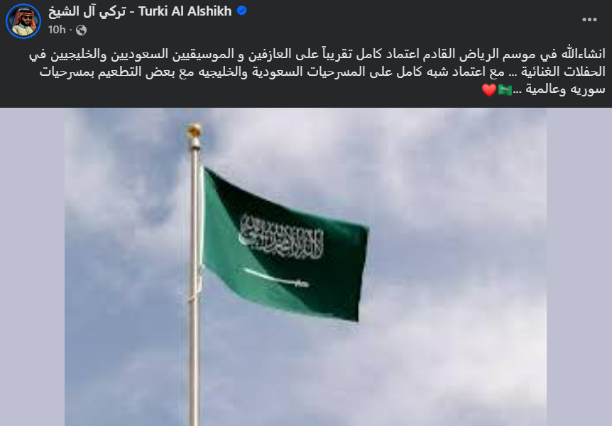 أعلن المستشار تركي آل الشيخ، رئيس الهيئة العامة للترفيه بالمملكة العربية السعودية، عن استغنائه عن الفنانين المصريين وعدم الاعتماد عليهم خلال موسم الرياض المقبل، وذلك خلال منشور عبر حسابه الشخصي بموقع التواصل الاجتماعي الأشهر "فيس بوك".