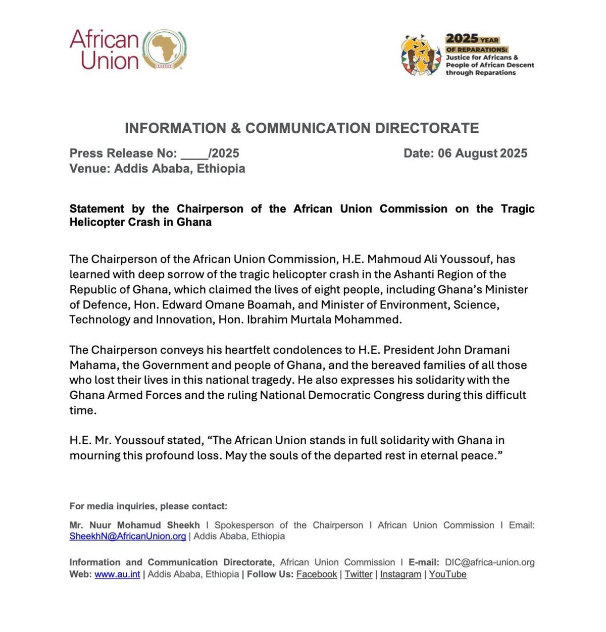تلقّى رئيس مفوضية الاتحاد الإفريقي، محمود علي يوسف، ببالغ الحزن والأسى نبأ تحطم المروحية المأساوي في منطقة أشانتي بجمهورية غانا، والذي أودى بحياة ثمانية أشخاص، من بينهم وزير الدفاع الغاني، إدوارد أومان بواما، ووزير البيئة والعلوم والتكنولوجيا والابتكار، معالي إبراهيم مورتالا محمد.