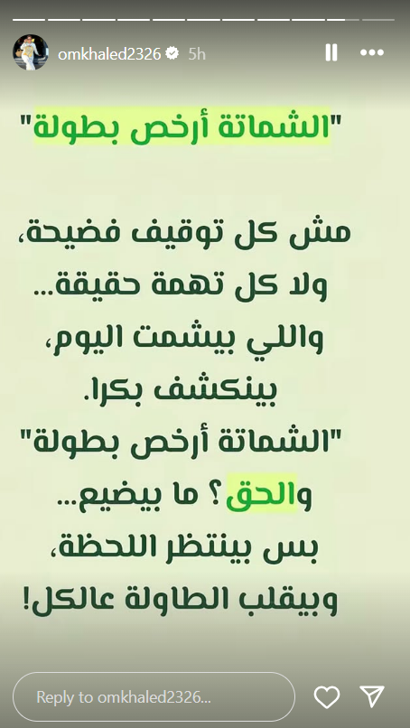 وكتبت أم خالد: “الشماتة أرخص بطولة.. مش كل توقيف فضيحة .. ولا كل تهمة حقيقة .. واللي بيشمت اليوم بينكشف بكرا”، مضيفة: “الشماتة أرخص بطولة والحق؟ ما بيضيع .. بس بينتظر اللحظة وبيقلب الطاولة على الكل”.