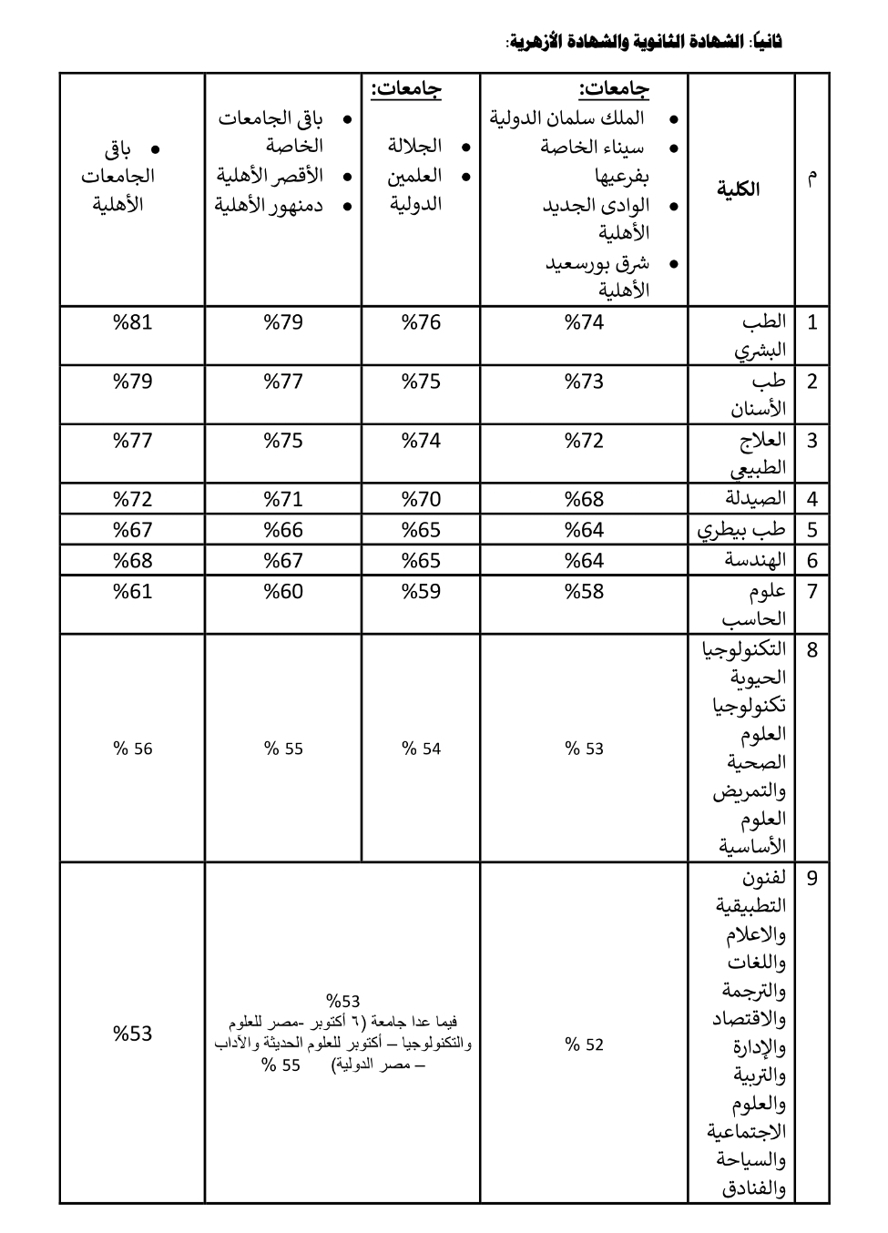 أما جامعة الملك سلمان وسيناء وشرق بورسعيد والإسماعيلية: يبلغ الحد الأدنى للقبول في كليات الطب 74 في المائة، و73 في المائة في طب الأسنان، و72 في المائة لكليات العلاج الطبيعي، و68 في المائة لكليات الصيدلة، و64 في المائة لكليات الهندسة، و58 في المائة لكليات علوم الحاسب، و53 في المائة التكنولوجيا الحيوية وتكنولوجيا العلوم الصحية والعلوم الأساسية والتمريض، و52 في المائة لكليات الفنون التطبيقية والإعلام واللغات والترجمة والاقتصاد والإدارة والتربية والعلوم الاجتماعية والسياحة والفنادق والحقوق والقانون والآثار والعلوم السينمائية.