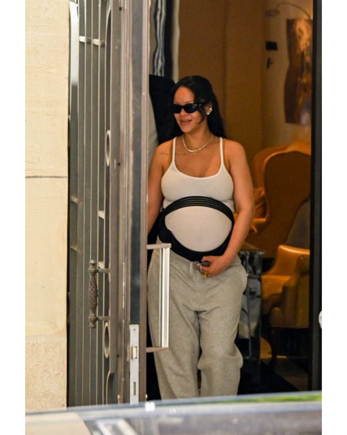 وفي السابق، ظهرت ريهانا مرتديةً توب أبيض بسيطة وبنطلون رياضي باللون الرمادي، وكانت المفاجأة ارتداءها مشد خصر اختارت أن تلفّه فوق ملابسها لا تحتها، في خروج متعمّد عن المألوف.