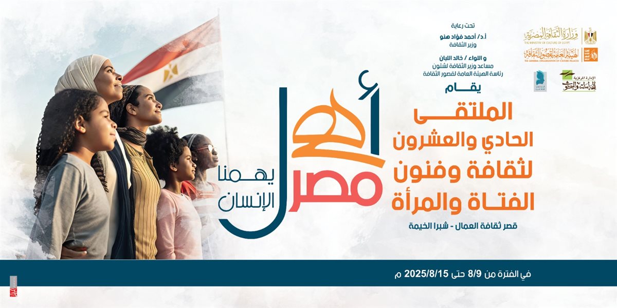 يشهد قصر ثقافة العمال بشبرا الخيمة، في السادسة مساء غدٍ السبت، انطلاق الملتقى الثقافي الحادي والعشرين لثقافة وفنون الفتاة والمرأة بالمحافظات الحدودية، الذي يقام ضمن أنشطة مشروع "أهل مصر"، وذلك برعاية الدكتور أحمد فؤاد هنو، وزير الثقافة، وتنظمه الهيئة العامة لقصور الثقافة، برئاسة اللواء خالد اللبان، وتستمر فعالياته حتى 15 أغسطس الجاري.