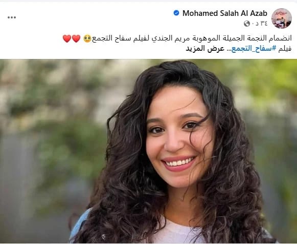 ونشر عبر حسابه على "فيسبوك"، صورة لمريم الجندي، معلقًّا عليها: "انضمام النجمة الجميلة الموهوبة مريم الجندي لفيلم سفاح التجمع".