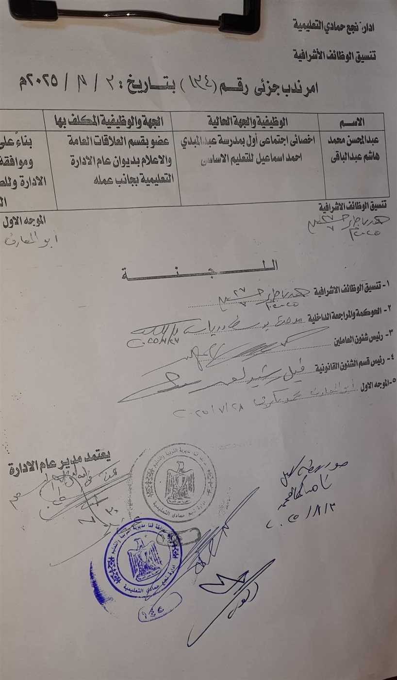 أصدر الدكتور عفت الوزيري "مدير عام الإدارة التعليمية بنجع حمادى بمحافظة قنا، أمر ندب جزئئ بتكليف عبد المحسن محمد هاشم، عضوًا بقسم العلاقات العامة والإعلام بديوان عام إدارة نجع حمادى التعليمية.
