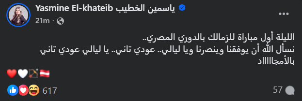 وكتبت ياسمين الخطيب: “الليلة أول مباراة للزمالك بالدوري المصري … نسأل الله أن يوفقنا وينصرنا ويا ليالي.. عودي تاني.. يا ليالي عودي تاني بالأمجاااااد”.
