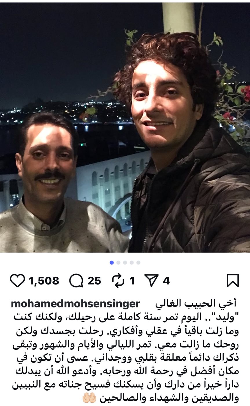 أحيا المطرب محمد محسن الذكرى الأولى لرحيل شقيقه الراحل وليد، عبر منشور مؤثر على حسابه في موقع «إنستجرام»، عبّر فيه عن حزنه العميق واشتياقه له.
