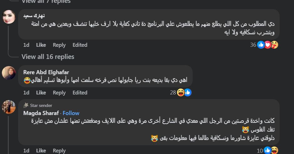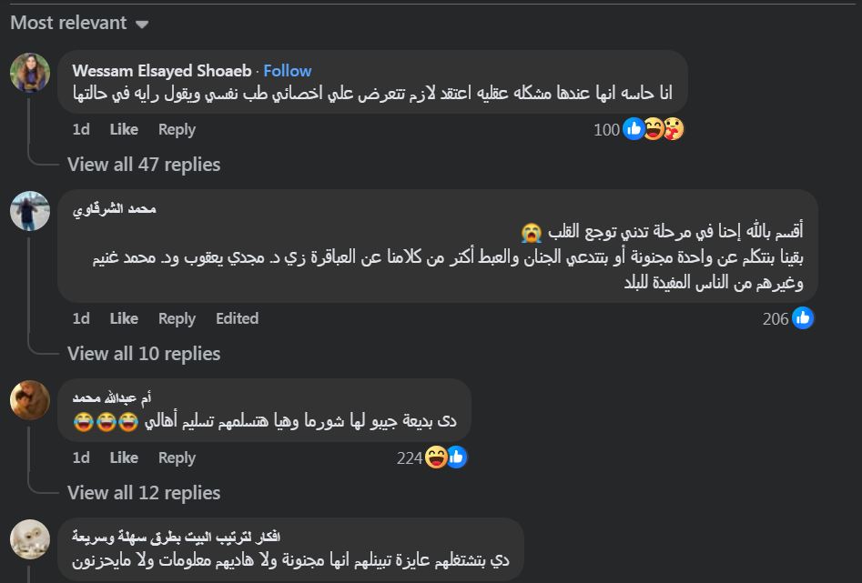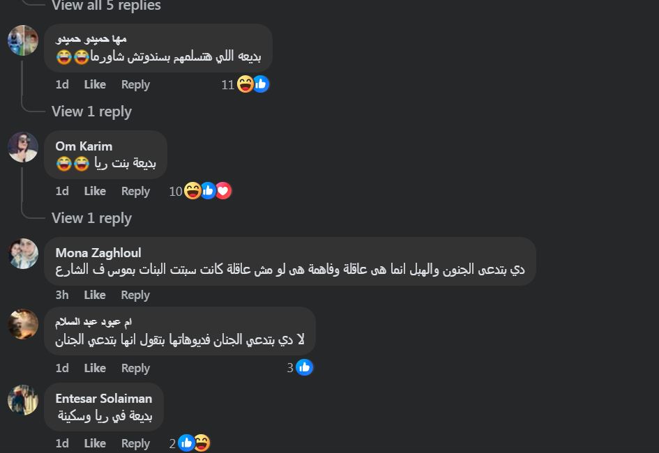 والأمر الذي جعل رواد السوشيال ميديا يضحكون على كلامها، وانهالت العديد من التعليقات الساخرة والتي جاءت كالآتي، "دى بديعة جيبو لها شاورما وهيا هتسلمهم تسليم أهالي"، "دي بتشتغلهم عايزة تبينلهم أنها مجنونة ولا هاديهم معلومات ولا مايحزنون"، "اهي دي بقا بديعة بنت ريا جابولها نص فرخة سلمت أمها وأبوها تسليم أهالي"، "البنت دي مريضة نفسية . نفسها تعيش حياة كريمة شافت الفلوس اتجنت"، "دي بتدعى الجنون والهبل إنما هى عاقلة وفاهمة هى لو مش عاقلة كانت ثبتت البنات بموس ف الشارع"، "بديعة اللي هتسلمهم بسندوتش شاورما"، "دي بديعة بنت ريا جيبولها الأكل اللي هيا عاوزاه وسيبو الباقي عليها هيا هتعترف بكل حاجة".