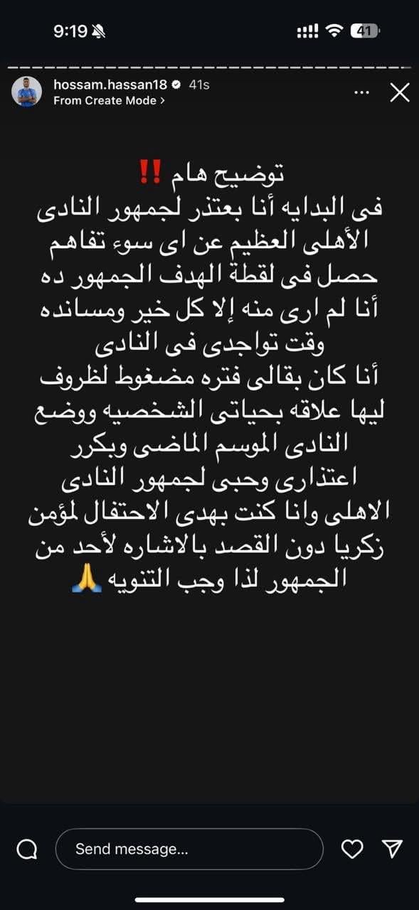 وكتب اللاعب عبر حسابه على موقع “إنستجرام”:“في البداية أنا بعتذر لجمهور النادي الأهلي العظيم عن أي سوء تفاهم حصل في لقطة الهدف. الجمهور ده أنا لم أرَ منه إلا كل خير ومساندة وقت تواجدي في النادي. كنت تحت ضغط لفترة بسبب ظروفي الشخصية ووضع النادي الموسم الماضي، وبكرر اعتذاري وحبي لجمهور الأهلي. الاحتفال كان إهداءً لمؤمن زكريا، ولم أقصد توجيه أي إشارة للجمهور، لذا وجب التنويه”.