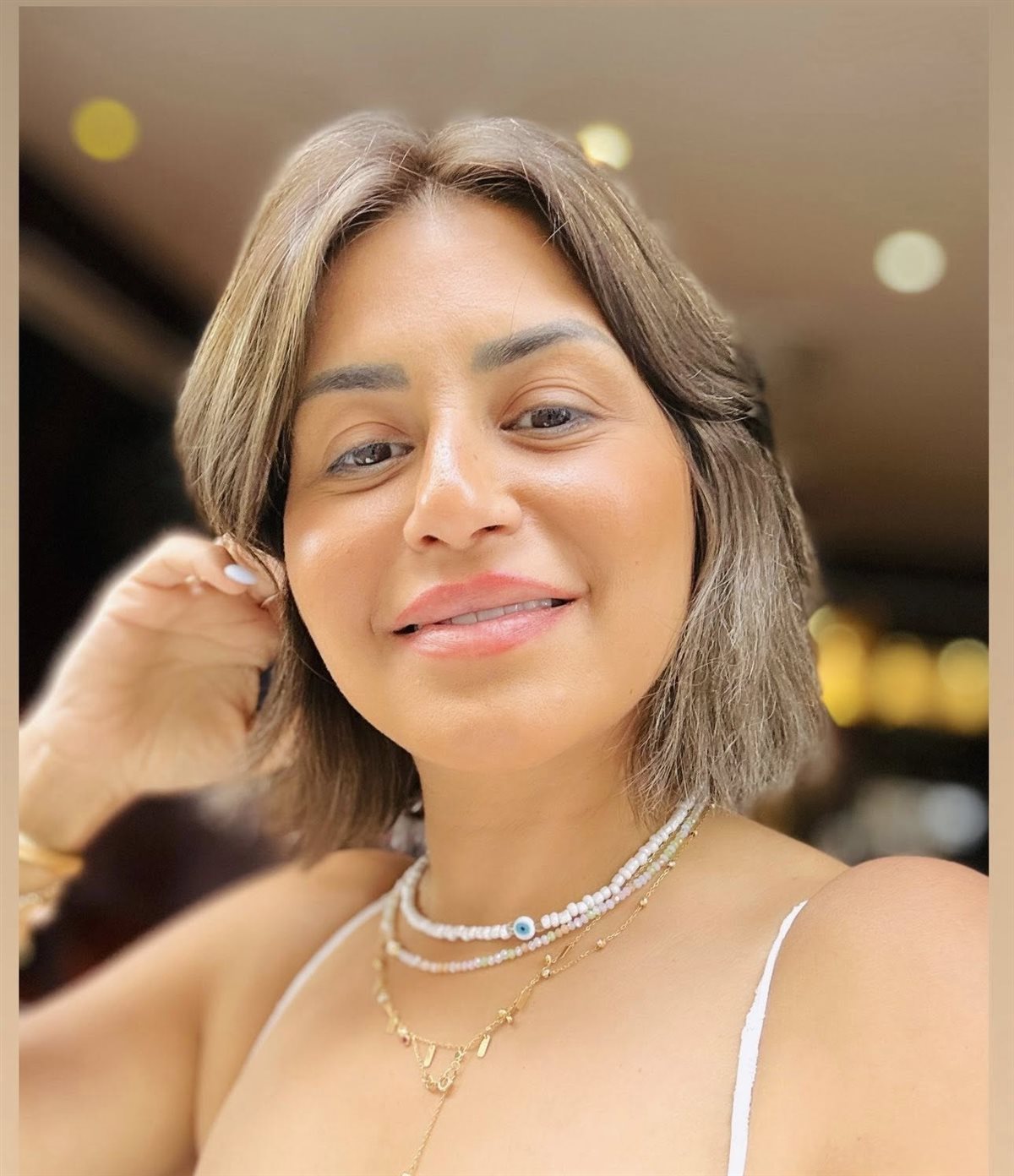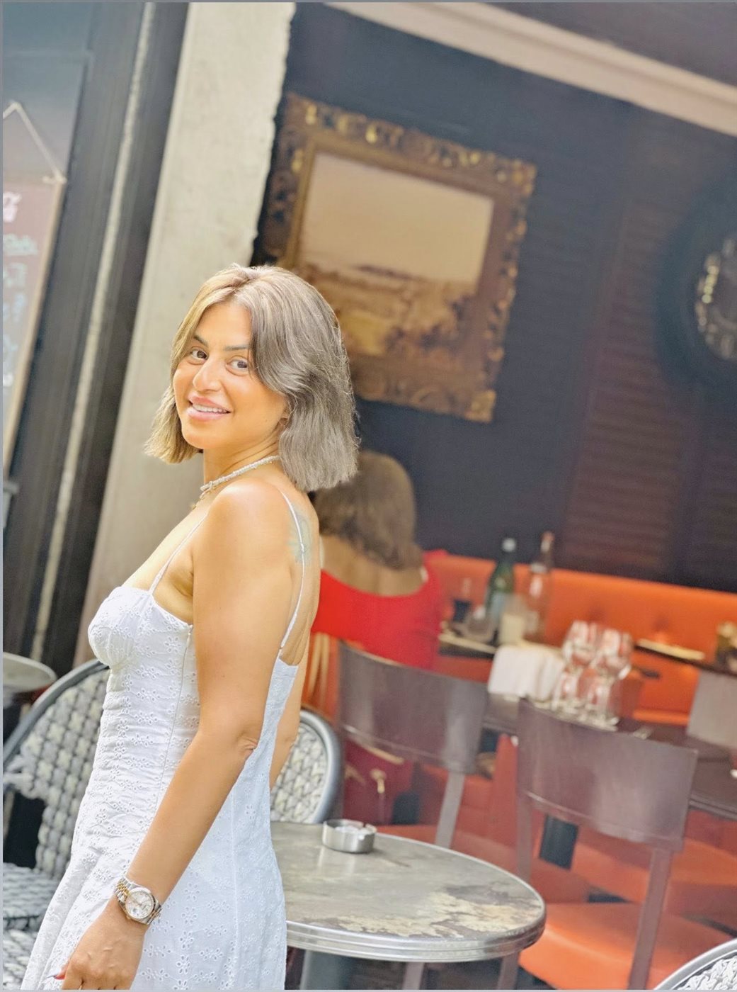 أما شعرها القصير فقد تركته منسدلًا بحرية على كتفيها بتسريحة ويڤي جذابة، أضافت إليها لمسة من الحيوية والأنوثة.