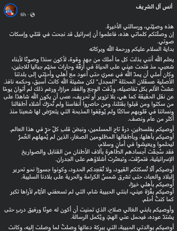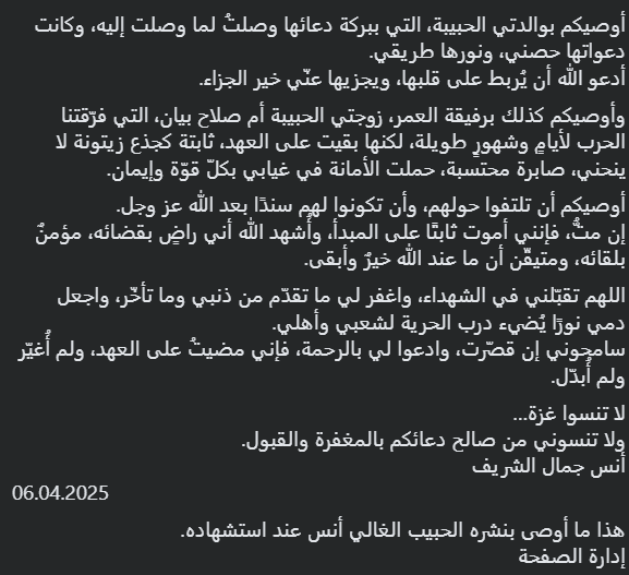 وجاءت وصية أنس الشريف كالآتي: "هذه وصيّتي، ورسالتي الأخيرة... إن وصلَتكم كلماتي هذه، فاعلموا أن إسرائيل قد نجحت في قتلي وإسكات صوتي... بداية السلام عليكم ورحمة الله وبركاته".