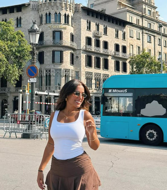 ولم يأتِ اختيارها لهذه الإطلالة من فراغ، فهي تعكس روحها المرحة وحبها للاستمتاع بكل لحظة في رحلاتها، حيث ظهرت مبتسمة ومليئة بالطاقة الإيجابية أثناء تجولها في شوارع مدينة إسبانية ذات طابع تاريخي وأبنية معمارية مميزة. وخلفها بدت الأشجار الخضراء والطرقات الواسعة، في مشهد يعكس جمال المكان وتناسقه مع أجواء صورتها.