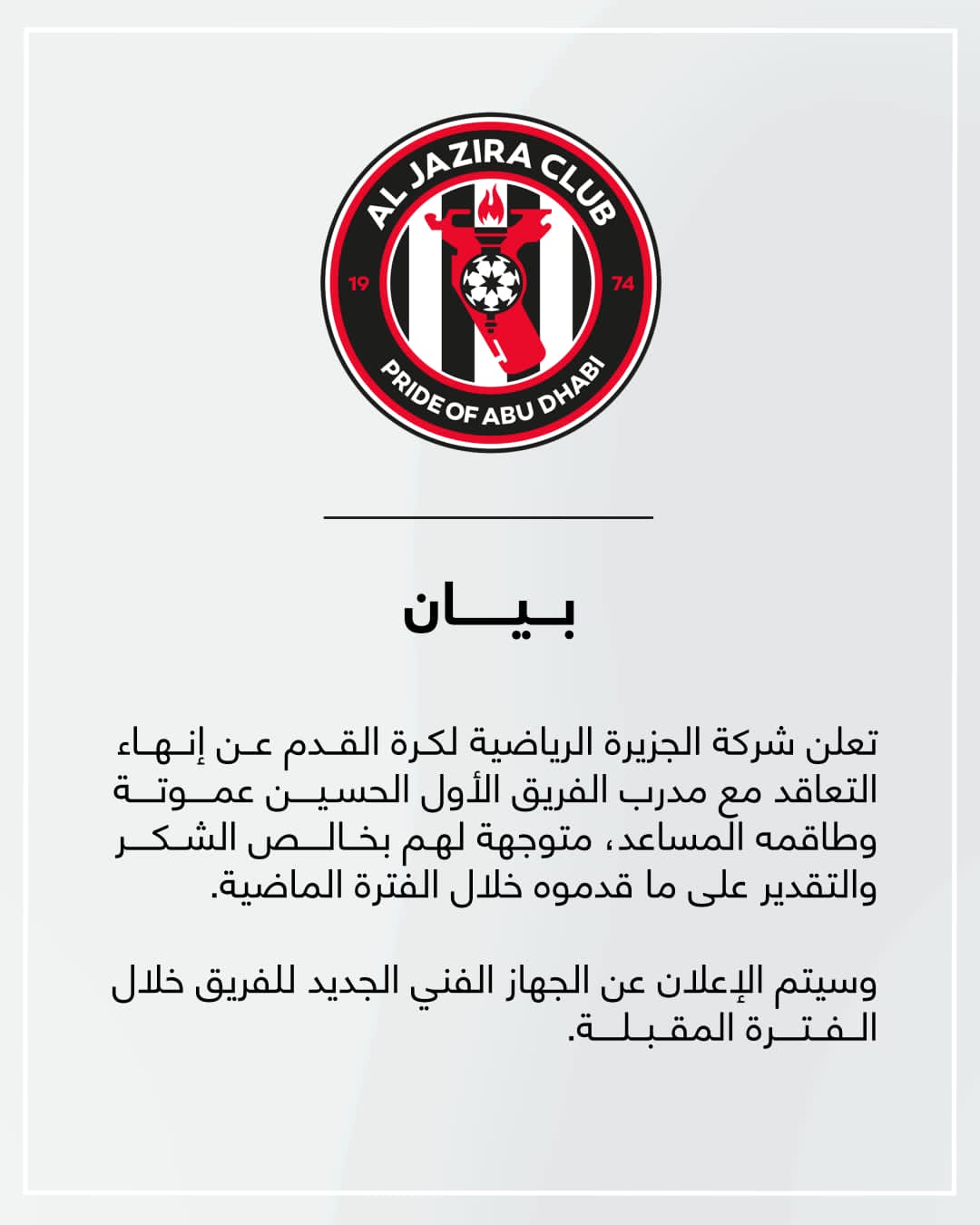 ونشر النادي بيانًا عبر حسابه الرسمي على منصة “إكس”، أكد فيه: “تعلن شركة الجزيرة الرياضية لكرة القدم عن إنهاء التعاقد مع مدرب الفريق الأول الحسين عموتة وطاقمه المساعد، متوجهة لهم بخالص الشكر والتقدير على ما قدموه خلال الفترة الماضية”. وأضاف البيان: “سيتم الإعلان عن الجهاز الفني الجديد للفريق خلال الفترة المقبلة”.