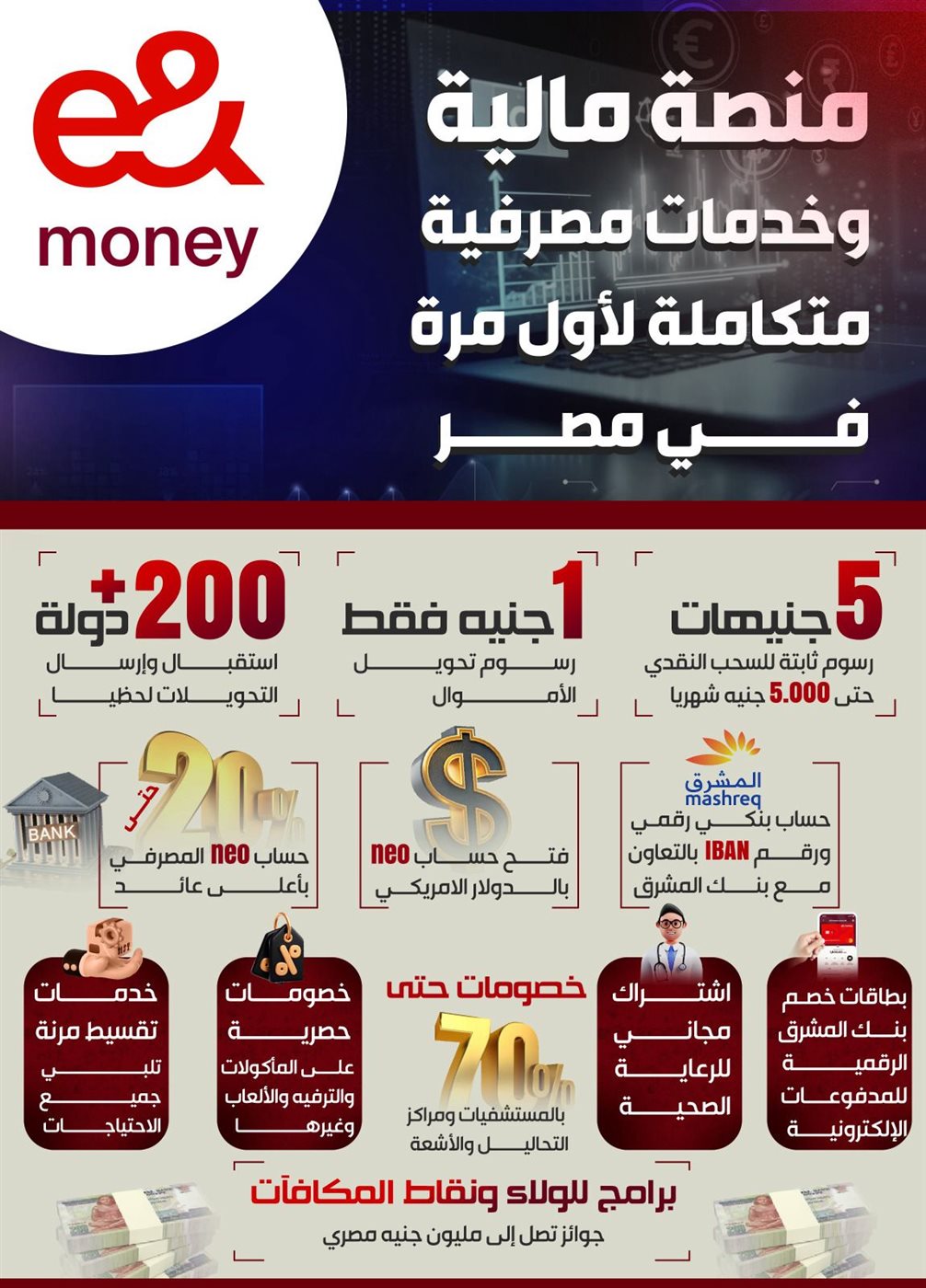 وترتقي "e& money" بخدمات المحافظ الرقمية إلى منظومة مالية متكاملة تجمع بين الخدمات المصرفية والرقمية بالتعاون مع بنك المشرق (Banking as a Service)، والتي تشمل فتح حساب مصرفي (إي اند مشرق نيو) بفائدة علي حسابات التوفير تصل إلى 20%، هي الأعلى في السوق المصري، والذي يُمكن العميل من الحصول على بطاقة ائتمان بمميزات تنافسية، وإمكانية فتح حساب بالدولار الأمريكي بسهولة، لإجراء و استقبال أي تحويلات دولية بكل سهولة ، هذا بالإضافة بإتاحة الفرصة لعملاء إي اند مشرق نيو بإجراء و استقبال التحويلات بالجنيه المصري لحظيًا.