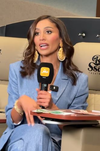 واختارت ترك خصلات شعرها منسدلة فوق كتفيها على طريقة الويفي الواسع ووضعت مكياجًا ناعمًا مرتكزًا على الألوان الترابية مع تحديد عينيها بالكحل والماسكرا السوداء ولون الكشمير في الشفاه.