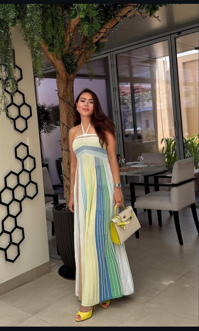 وبدت أسما إبراهيم بإطلالة ساحرة تمزج بين الاناقه والرقي في آن واحد لتخطف الاضواء الي سحر أناقتها المواكبة لأحدث صيحات الموضة، مرتديه فستان طويل فضفاض صمم من قماش ناعم بألوان صيف 2025، لتبرز سحر الألوان بشكل هادئ، فيما انتعلت صندلا بكعب عال.