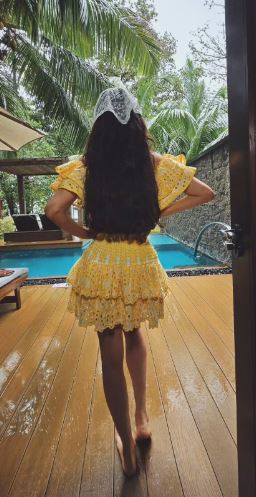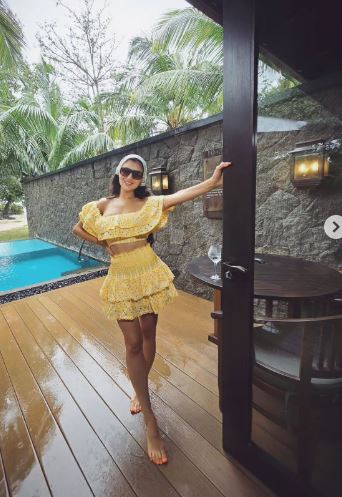 وبدت مي عمر بإطلالة صيفية، مستعرضة قوامها الرشيق وخصرها المنحوت، مرتديه توب قصير كشف عن خصرها ونسقت عليه ميني جيب باللون الأصفر الكناري.