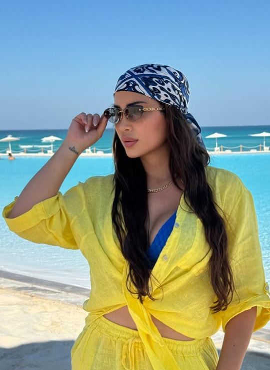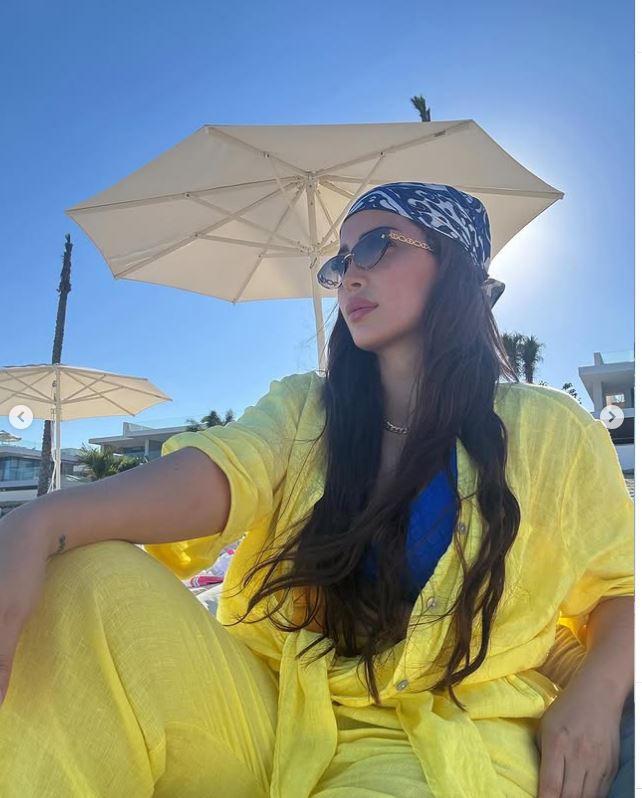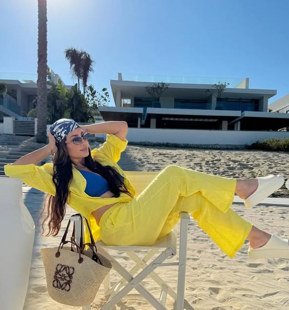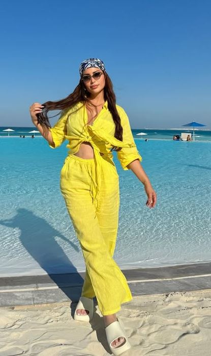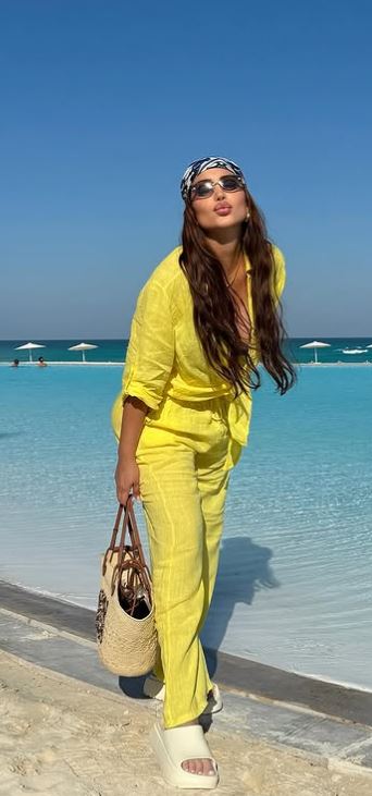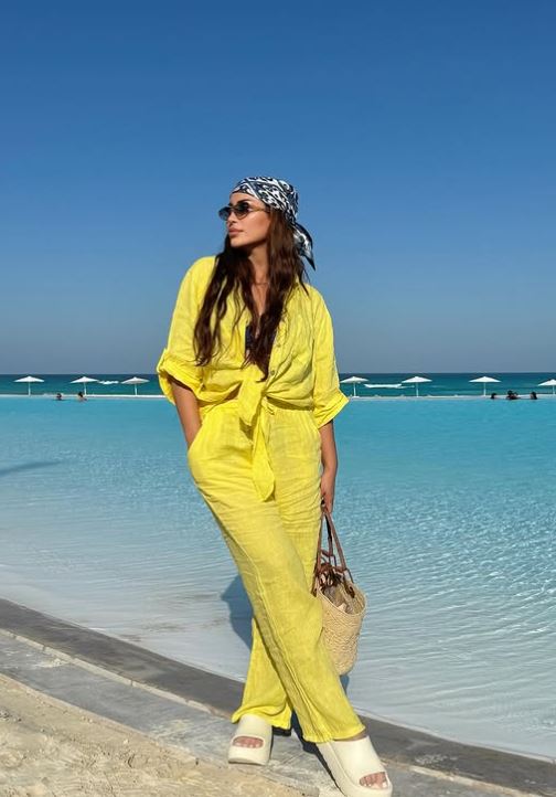 وبدت نسرين طافش بإطلالة صيفية ممبهجة، قميص فضفاض وعليه بنطال صمم من قماش ناعم باللون الأصفر الزاهي وتحته بكيني أرزق اللون.