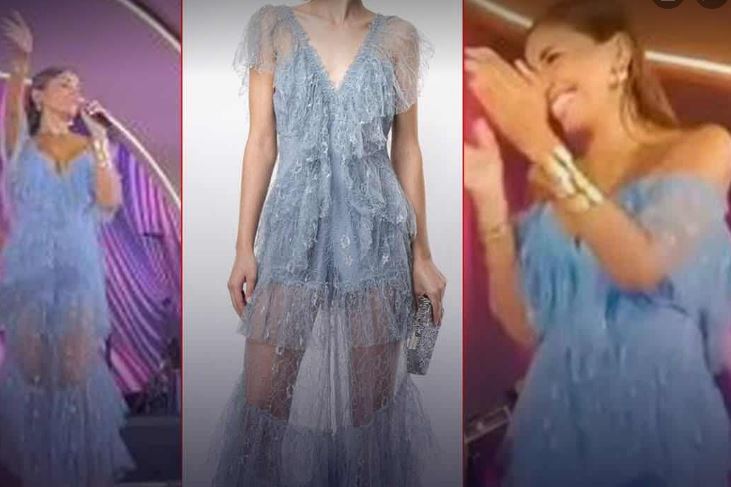 وبدت دينا الشربيني بإطلالة ساحرة، مواكبة لأحدث صيحات الموضة العالمية، مرتدية جمبسوت أنيق التصميم مجسم مصمم من الدانتيل باللون اللبني، وبلغ سعره 4600 ألف جنيه.