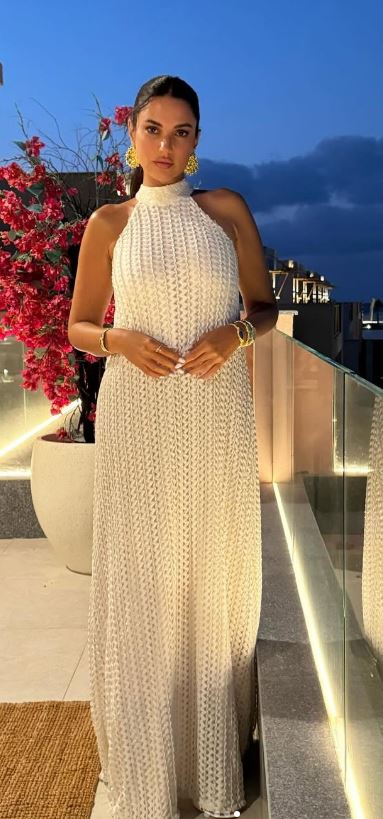 وبدت درة زروق بإطلالة ساحرة، مزجت بين الاناقة والرقي ليتناغم مع ذوقها الرفيع المحب للبساطة، مرتدية فستان طويل فضفاض، بلياقة عالية، صمم من خيوط التريكو باللون الأبيض لتواكب موضة فساتين التريكو هذا العام، الفستان عكس قوامها الرشيق ووزنها المثالي.