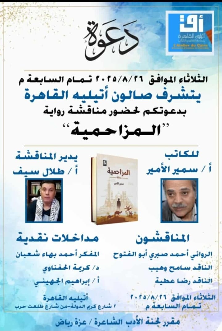 يستضيف أتيليه القاهرة في السابعة مساء اليوم الثلاثاء، الموافق ٢٦ أغسطس، ندوة لمناقشة رواية (المزاحمية)، للشاعر سمير الأمير.