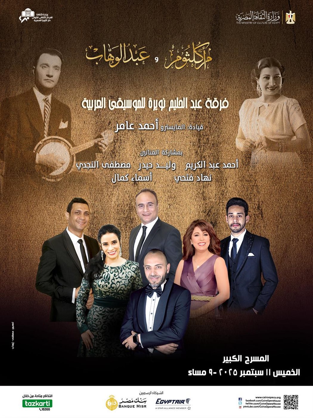تستقبل دار الأوبرا المصرية ليلة خاصة لمحبي الطرب، تجمع بين كوكب الشرق أم كلثوم وموسيقار الأجيال محمد عبد الوهاب، ضمن سلسلة الحفلات الصيفية المقامة في مختلف فروعها .