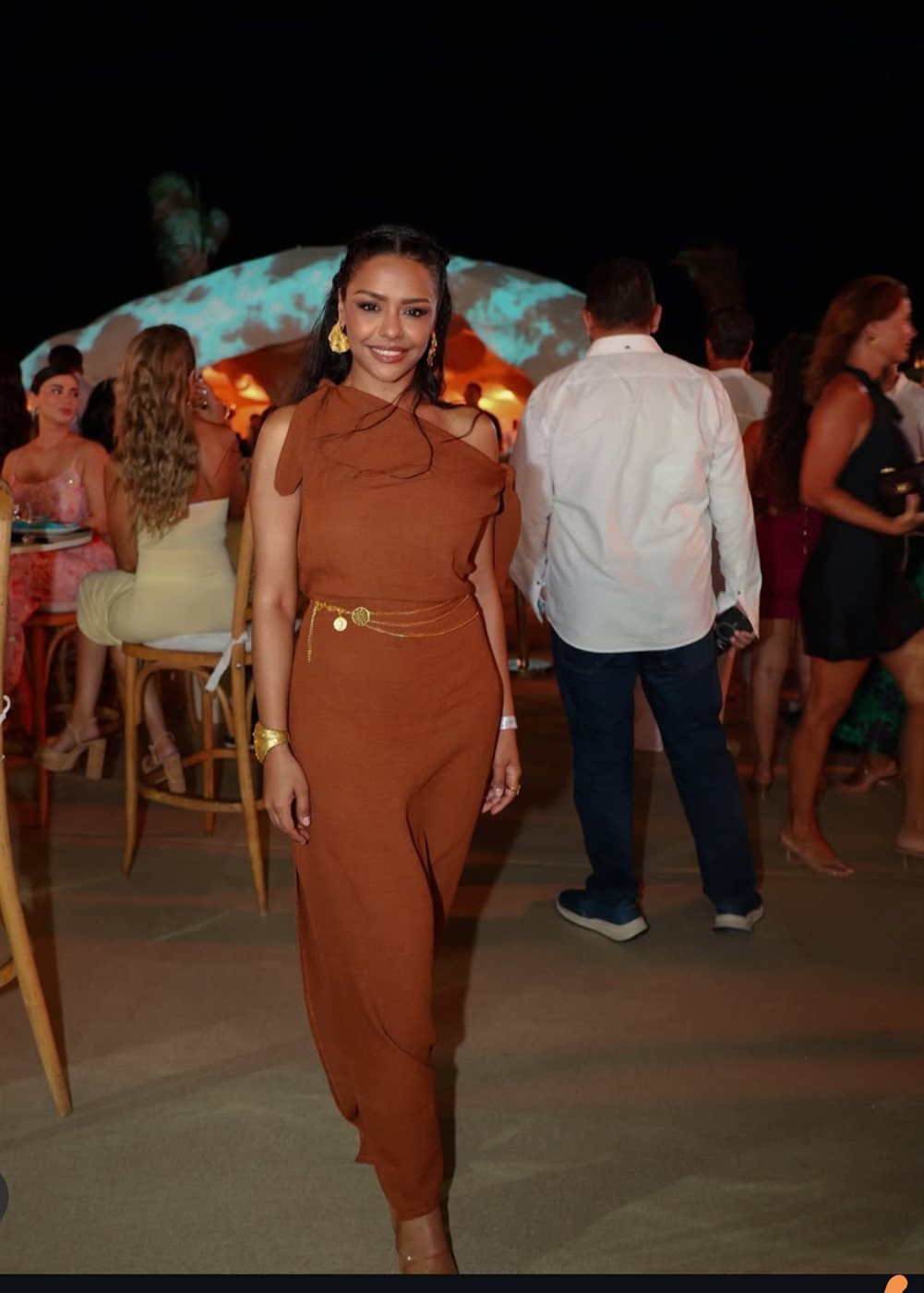 ونجحت في عكس جمال روحها و ملامحها المصرية التي تشبه سمراء النيل بوضع لمسات ناعمة من المكياج وتحديد عينيها بالكحل والماسكرا مع لون النود اللامع في الشفاه.