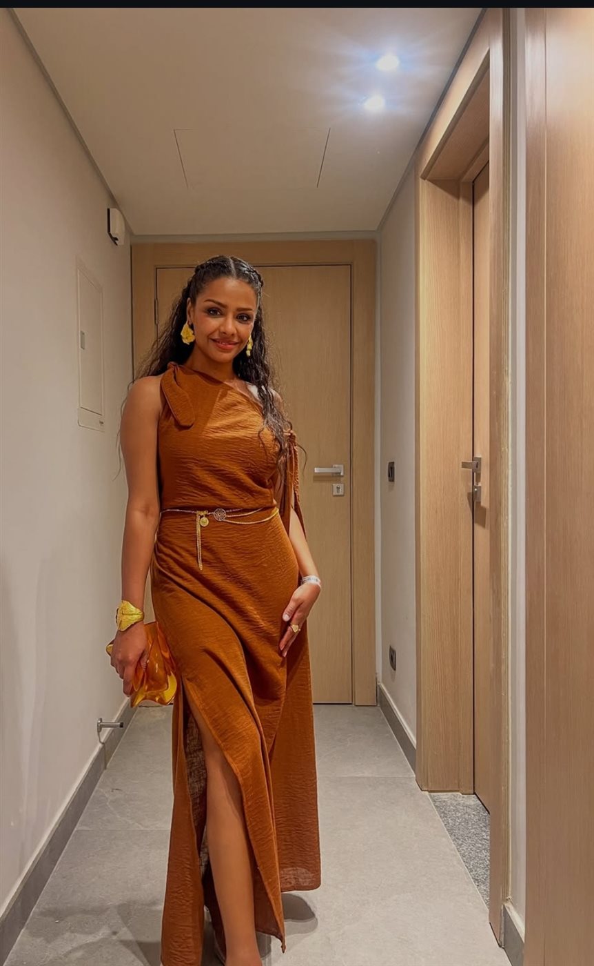 وبدت أسما بإطلالة صيفية ناعمة، مرتديه فستان طويل مجسم ينتمي لقصه ألوان شولدر صمم من قماش ناعم باللون البيني الغامق وزينته بحزام رفيع حول خصرها.