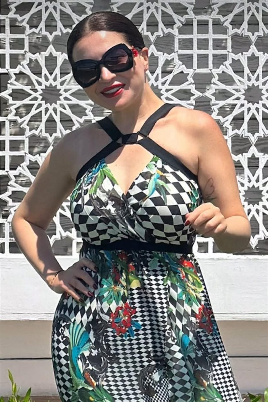 وتنجذب مي عز الدين للبساطه في اختيار ازيائها لتتربع على عرش الجمال دون الميل للتكلف والتصنع، وبدت بفستان صيفي بسيط التصميم صمم من قماش ناعم الرسومات الهندسية المزينة بالزهور الحمراء، عكس الفستان قوامها الرشيق ووزنها المثالي.