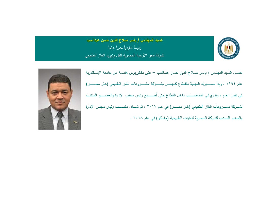 كما أصدر المهندس كريم بدوي وزير البترول والثروة المعدنية قرارا بتكليف المهندس ياسر صلاح الدين حسن عبدالسيد رئيسا تنفيذيا مديرا عاما لشركة فجر الاردنية المصرية لنقل وتوريد الغاز الطبيعي، وحصل المهندس ياسر صلاح الدين علي بكالوريوس هندسة من جامعة الإسكندرية عام 1994 وبدأ مسيرته المهنية بالقطاع كمهندس بشركة مشروعات الغاز الطبيعي (غاز مصر) في نفس العام، وتدرج في المناصب داخل القطاع حتي أصبح رئيس مجلس الإدارة والعضو المنتدب لشركة مشروعات الغاز الطبيعي (غاز مصر) في عام 2017، ثم شغل منصب رئيس مجلس الإدارة والعضو المنتدب للشركة المصرية للغازات الطبيعية (جاسكو) في عام 2018.