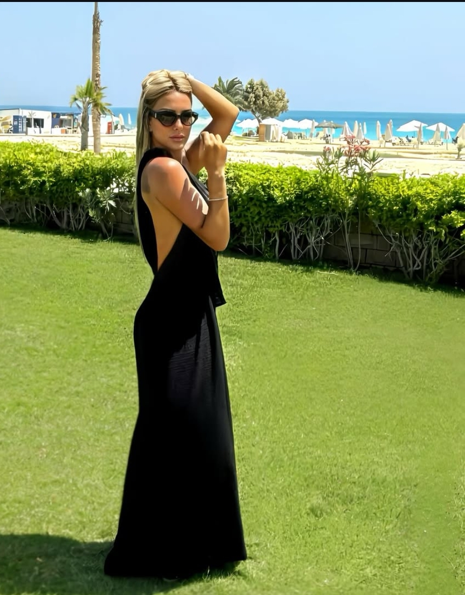وبدت ريم مصطفى بإطلالة صيفية، مرتديه فستان طويل فضفاض، بظهر مكشوف،  مصمم من قماش الساتان باللون الأسود لتستعرض قوامها الرشيق ووزنها المثالي.