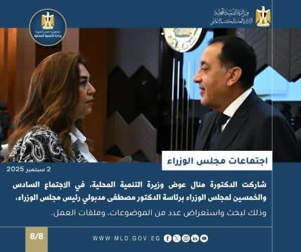 كما شاركت الدكتورة منال عوض وزيرة التنمية المحلية في الاجتماع السادس والخمسين لمجلس الوزراء برئاسة الدكتور مصطفى مدبولي رئيس مجلس الوزراء، وذلك بمقر الحكومة بالعاصمة الإدارية الجديدة، حيث تم بحث واستعراض عدد من الموضوعات، وملفات العمل.