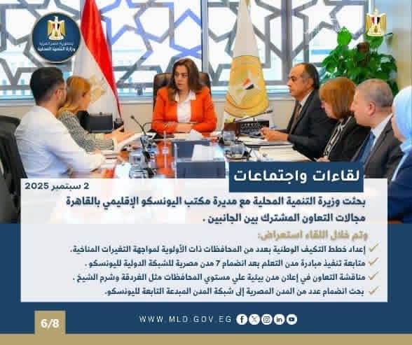 التقت الدكتورة منال عوض وزيرة التنمية المحلية مع الدكتورة نوريا سانز مدير مكتب اليونسكو الإقليمي بالقاهرة والسودان بمقر الوزارة بالعاصمة الإدارية الجديدة، حيث تم بحث مجالات التعاون المشترك.
