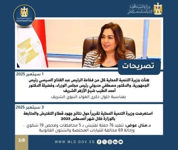 تلقت الدكتورة منال عوض وزيرة التنمية المحلية، تقريرًا من قطاع تقويم الأداء والمتابعة والتفتيش بالوزارة، حول نتائج جهود القطاع خلال شهر أغسطس 2025، لتحقيق الانضباط داخل وحدات الإدارة المحلية بمختلف المحافظات، حيث تم تنفيذ 76 حملة تفتيشية (مخططة ومفاجئة وفحص شكاوى للمواطنين) في 5 محافظات هي (القاهرة، الجيزة، الشرقية، دمياط ، المنوفية)، مما أسفرت تلك الجهود عن إحالة 69 حالة إلى النيابات المختصة والشئون القانونية، لاتخاذ الإجراءات القانونية اللازمة فيما تم رصده من مخالفات