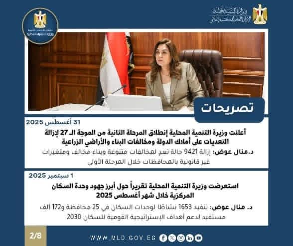 أعلنت الدكتورة منال عوض وزيرة التنمية المحلية، عن بدء تنفيذ المرحلة الثانية من الموجة السابعة والعشرين من حملات الإزالة، والتي تستهدف إزالة التعديات على أراضي أملاك الدولة، والبناء المخالف، والتعديات على الأراضي الزراعية والمقرر تنفيذها خلال الفترة من ٣٠-٨-٢٠٢٥ وحتى ٢٦-٩-٢٠٢٥ .