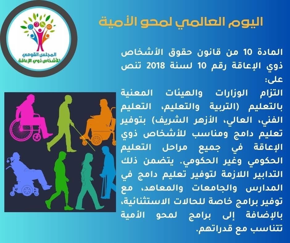 وأضافت المشرف العام على المجلس القومي للأشخاص ذوي الإعاقة أنه في هذا اليوم العالمي يجب التأكيد والتنويه إلى نص المادة (10) من قانون حقوق الأشخاص ذوي الإعاقة رقم 10 لسنة 2018، والتي تلزم الوزارات والهيئات المعنية بالتعليم – من التعليم العام والفني والعالي والأزهر الشريف – بتوفير تعليم دامج ومناسب للأشخاص ذوي الإعاقة في جميع المراحل، مع توفير برامج خاصة للحالات الاستثنائية، إلى جانب برامج لمحو الأمية تتناسب مع قدراتهم وإمكاناتهم.