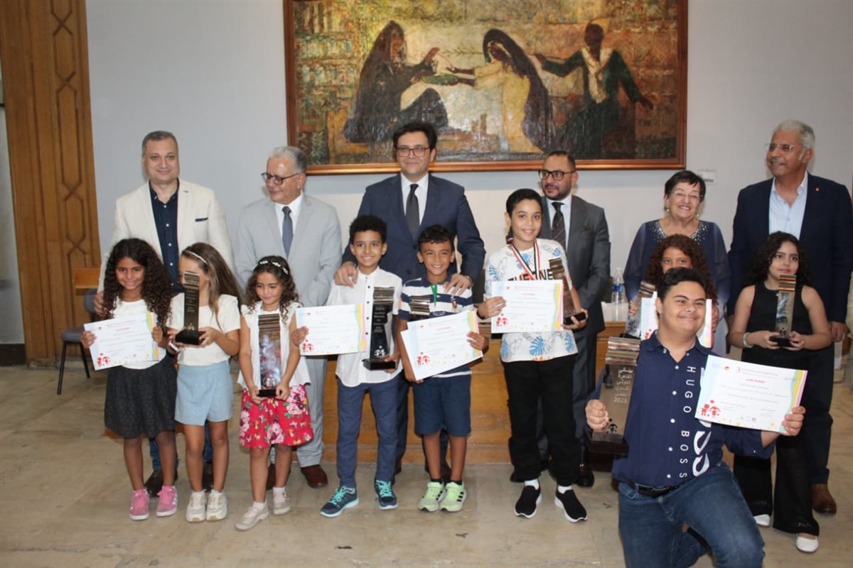 أولاً: جائزة لجنة التحكيم لكل من: العمل الجماعي (مرسم الفنان الصغير) بنادي سبورتينج بالإسكندرية،- إياد زيشيان (الهند)".