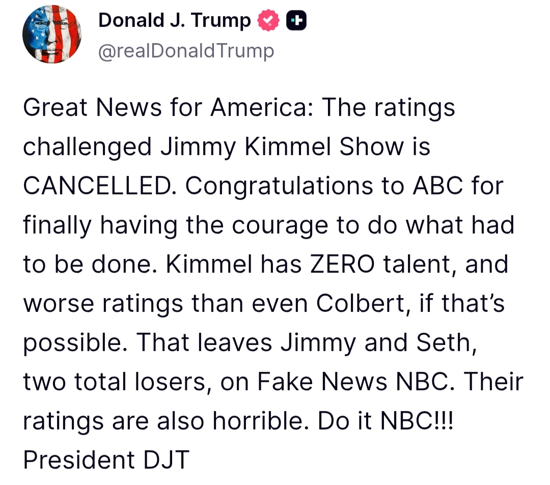 كما احتفل ترامب بتعليق برنامج كيميل كتب على منصته “تروث سوشيال”:"أخبار سارة لأمريكا: تم إلغاء برنامج جيمي كيميل الذي كان محلّ تساؤل حول نسب المشاهدة.. تهانينا لشبكة ABC على امتلاكها الشجاعة أخيرًا للقيام بما كان يجب القيام به.. كيميل لا يمتلك أي موهبة، ونسب مشاهدته أسوأ من كولبير، إن أمكن.. هذا يترك جيمي وسيث، وهما خاسران تمامًا، على قناة NBC التي تبثّ الأخبار الكاذبة.. نسب مشاهدتهما أيضًا سيئة للغاية. افعلوها يا NBC!!!".