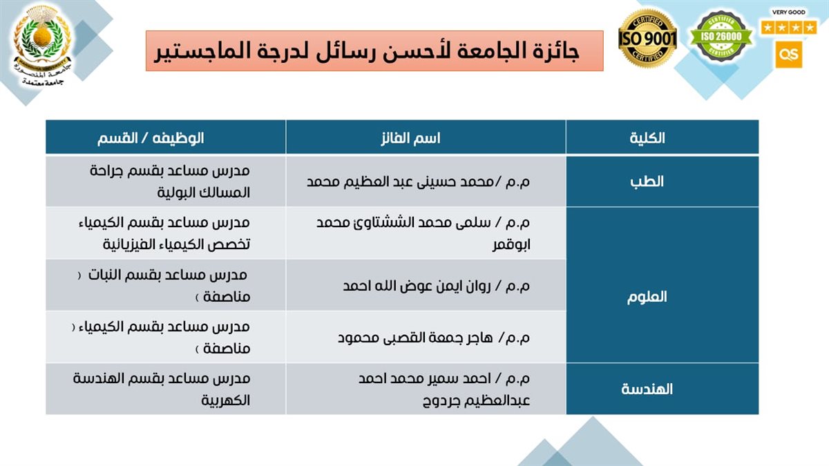 أما جوائز الجامعة لأفضل الرسائل العلمية (الماجستير)، فقد ذهبت إلى كل من: المدرس المساعد محمد حسيني عبدالعظيم محمد – بقسم جراحة المسالك البولية بكلية الطب، والمدرس المساعد سلمى محمد الششتاوي محمد أبوقمر – بقسم الكيمياء (كيمياء فيزيائية) بكلية العلوم، والمدرس المساعد روان أيمن عوض الله أحمد – بقسم النبات بكلية العلوم (مناصفة) مع المدرس المساعد هاجر جمعة القصبي محمود – بقسم الكيمياء بكلية العلوم، والمدرس المساعد أحمد سمير محمد أحمد عبدالعظيم جردوح – بقسم الهندسة الكهربية بكلية الهندسة، والمدرس المساعد مها محمد عبدالمنعم إبراهيم – بقسم الكيمياء التحليلية الصيدلية بكلية الصيدلة، والمدرس المساعد محمد عادل علي الطنطاوي – بقسم الصيدلانيات بكلية الصيدلة، والمدرس المساعد آية جمال أحمد عياد – بقسم تكنولوجيا المعلومات بكلية الحاسبات والمعلومات، والمدرس المساعد محمد أحمد طاهر عبدالرحمن النقيب – بقسم التاريخ بكلية الآداب، والمدرس المساعد منار عثمان السيد محمد إبراهيم – بقسم الاقتصاد المنزلي بكلية التربية النوعية (منية النصر).
