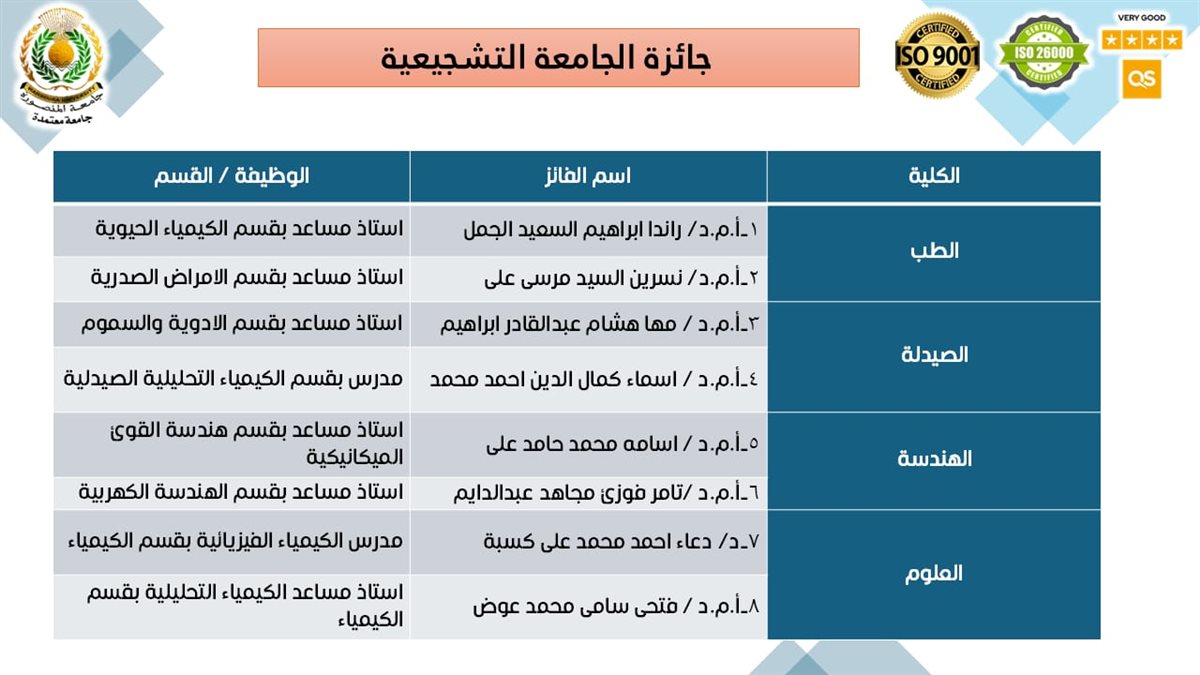 وفي جوائز الجامعة التشجيعية، جاءت الأسماء الفائزة على النحو التالي: من كلية الطب الدكتورة راندا إبراهيم السعيد الجمل – أستاذ مساعد بقسم الكيمياء الحيوية، والدكتورة نسرين السيد مرسي علي – أستاذ مساعد بقسم الأمراض الصدرية. ومن كلية الصيدلة الدكتورة مها هشام عبدالقادر إبراهيم – أستاذ مساعد بقسم الأدوية والسموم، والدكتورة أسماء كمال الدين أحمد محمد – مدرس بقسم الكيمياء التحليلية الصيدلية. ومن كلية الهندسة الدكتور أسامة محمد حامد علي – أستاذ مساعد بقسم هندسة القوى الميكانيكية، والدكتور تامر فوزي مجاهد عبدالدايم – أستاذ مساعد بقسم الهندسة الكهربية. ومن كلية العلوم الدكتورة دعاء أحمد محمد علي كسبة – مدرس بقسم الكيمياء (كيمياء فيزيائية)، والدكتور فتحي سامي محمد عوض – أستاذ مساعد بقسم الكيمياء (كيمياء تحليلية). ومن كلية الطب البيطري الدكتورة جهاد السعيد عبدالجليل أحمد – أستاذ مساعد بقسم الباثولوجيا، والدكتورة سارة طه محمد محمد العزب – أستاذ مساعد بقسم الأدوية. ومن كلية التربية النوعية – فرع ميت غمر، الدكتورة منى ياسر عبدالخالق مصطفى – أستاذ مساعد بقسم التغذية وعلوم الأطعمة. ومن كلية علوم الرياضة الدكتور وائل عوض رمضان محمد – أستاذ مساعد بقسم التدريب الرياضي.