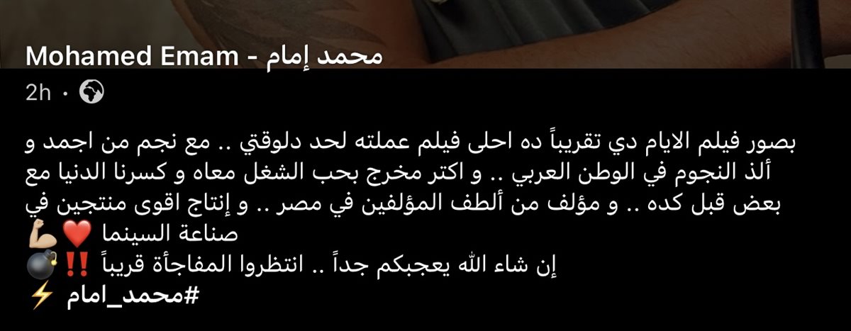 وعبر صفحته الرسمية على موقع «فيسبوك»، كتب إمام: «بصور فيلم الأيام دي، تقريبًا ده أحلى فيلم عملته لحد دلوقتي.. مع نجم من أجمد وألذ النجوم في الوطن العربي، وأكثر مخرج بحب الشغل معاه وكسرنا الدنيا مع بعض قبل كده، ومؤلف من ألطف المؤلفين في مصر، وإنتاج أقوى منتجين في صناعة السينما.. إن شاء الله يعجبكم جدًا، انتظروا المفاجأة قريبًا».