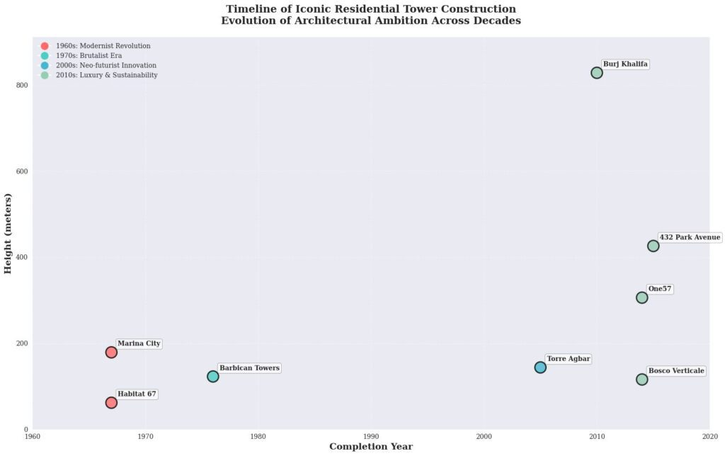 من خلال تتبع التطور الزمني للأبراج الأيقونية، ألاحظ أن الستينات والسبعينات شهدت رواد الحداثة مثل Marina City في شيكاغو وHabitat 67 في مونتريال، بينما العقد الأخير (2010-2015) شهد ثورة حقيقية في الأبراج الفاخرة والمستدامة. هذا التطور يذكرني بتطور السوق الإماراتي على مدى العقدين الماضيين.