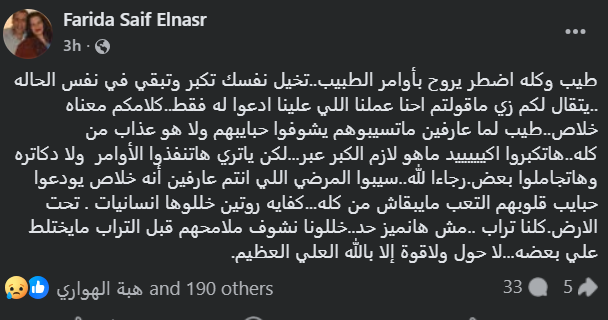 وكتبت فريدة سيف النصر: “طيب وكله اضطر يروح بأوامر الطبيب.. تخيل نفسك تكبر وتبقي في نفس الحالة.. يتقال لكم زي ما قولتم احنا عملنا اللي علينا ادعوا له فقط.. كلامكم معناه خلاص.. طيب لما عارفين ماتسيبوهم يشوفوا حبايبهم ولا هو عذاب من كله.. هاتكبروا أكيييييد ماهو لازم الكبر عبر... لكن يا ترى هاتنفذوا الأوامر، ولا دكاتره وهاتجاملوا بعض”.