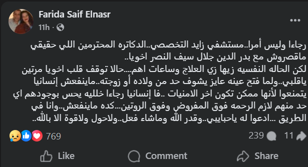 كما كتبت في منشور آخر: “رجاءً وليس أمرًا..، الدكاتره المحترمين اللي حقيقي ما قصروش مع بدر الدين جلال سيف النصر “أخويا”، لكن الحالة النفسية زيها زي العلاج وساعات أهم”.